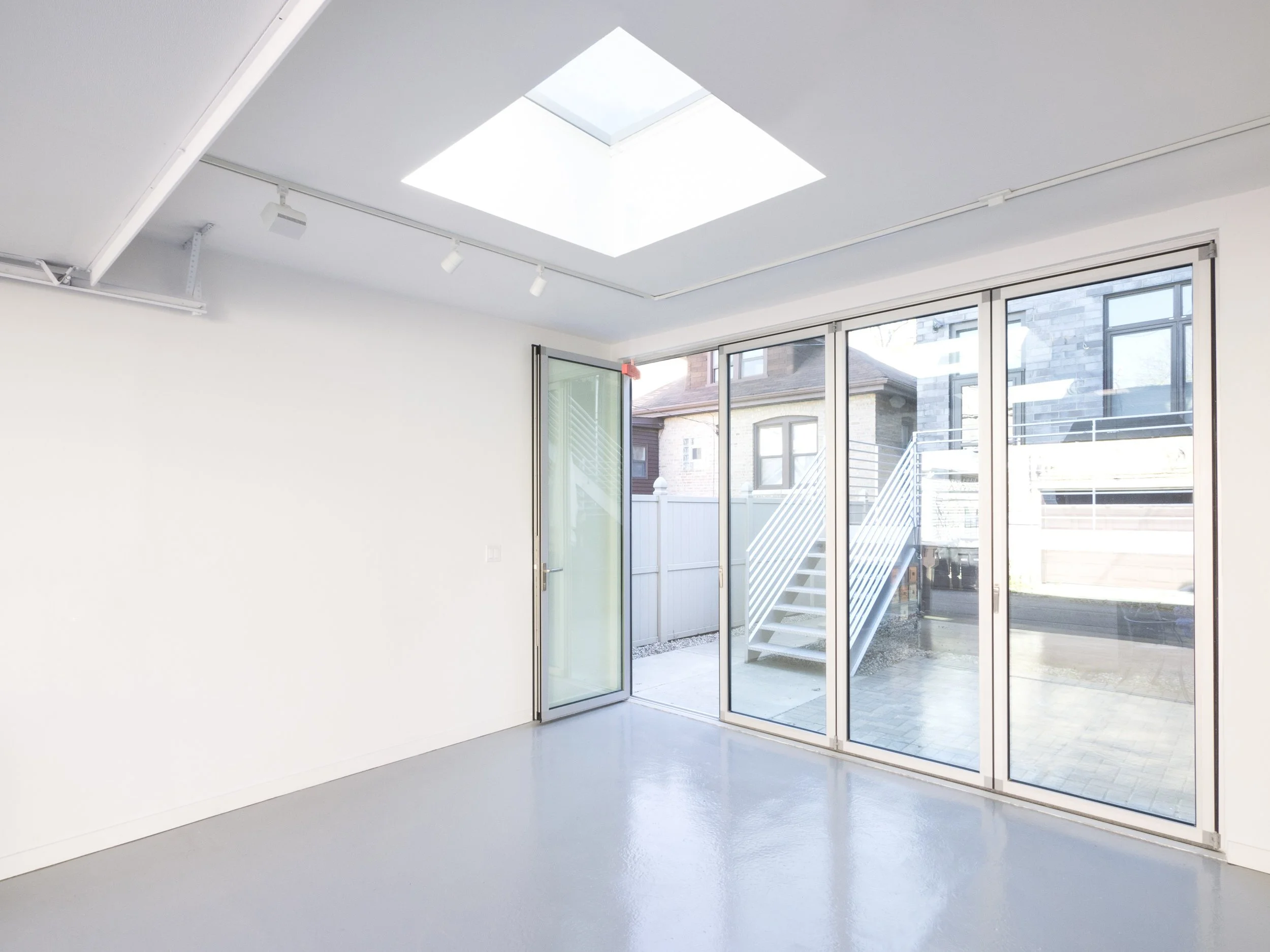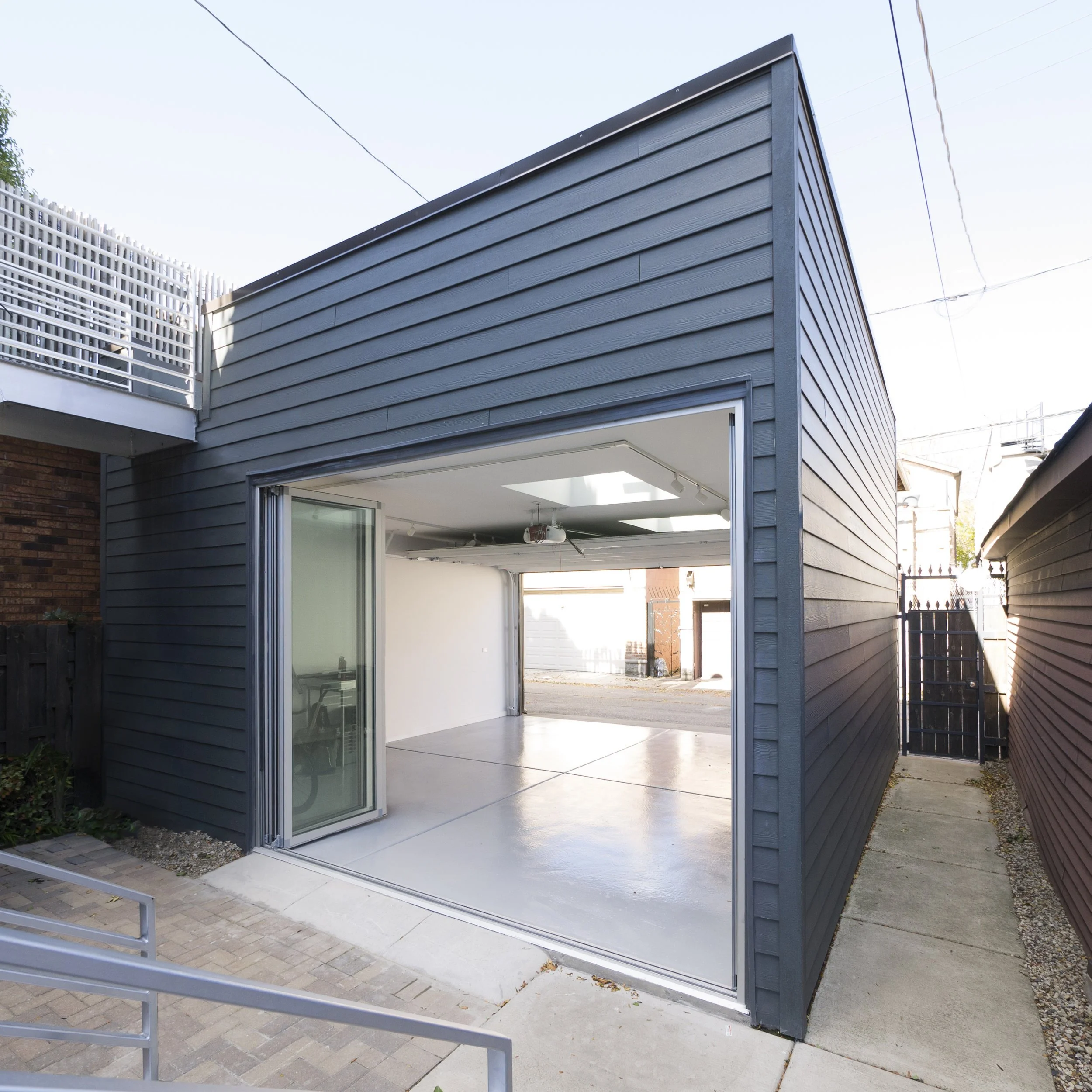 The owner of this townhouse in Ukrainian Village wanted an art studio to paint and sculpt, as well as an enlarged outdoor space to accommodate social events. However, the property’s zoning constraints did not allow for an addition to the residence or for an expanded porch or roof terrace. An unusual solution was developed by overlapping these desired uses on the allowable footprint of the 20’x20’ detached garage. In contrast to a typical garage, which only opens towards the street, this structure was designed with apertures in each direction. Large operable skylights provided ample daylight and ventilation, and full height bi-folding glass doors opened towards the existing patio, more than doubling the size of the outdoor space. Depending on season and operation, the structure can be used as a garage, as an art studio or as an extension of the backyard.