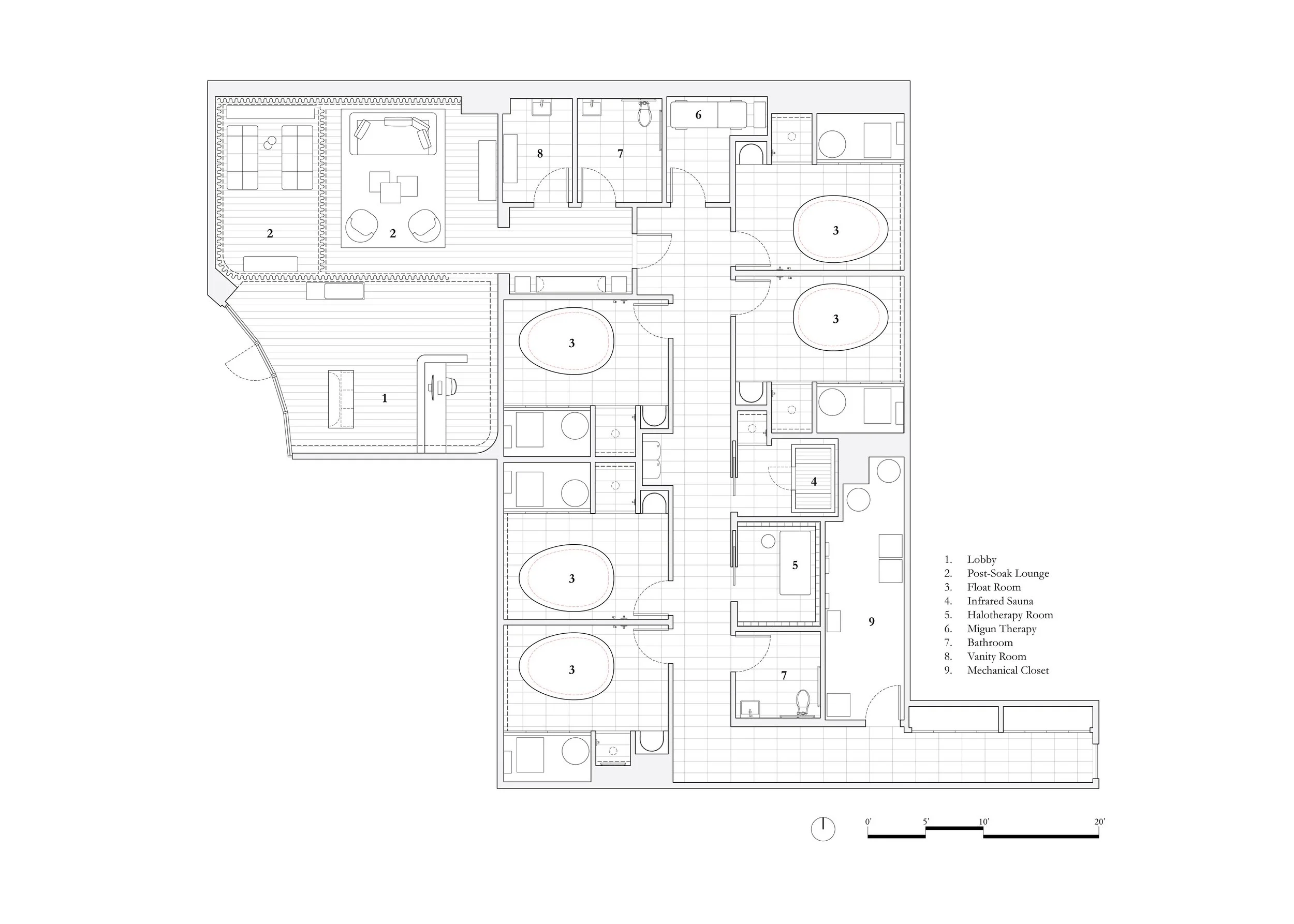 Given the high humidity and salinity, materials and detailing were selected for durability, longevity, and ease of maintenance. Climate control systems were designed to manage temperature and humidity levels individually, ensuring both user comfort and energy efficiency. Mechanical and accessory spaces, along with treatment rooms for other therapies, were carefully arranged between float rooms to allow for a private and seamless experience. The post-float lounge is divided by movable curtains, offering flexible zones for reflection or social gathering. The overall architectural language supports a broad range of uses and interpretations while centering the embodied experience of stillness, transition, and material quiet.